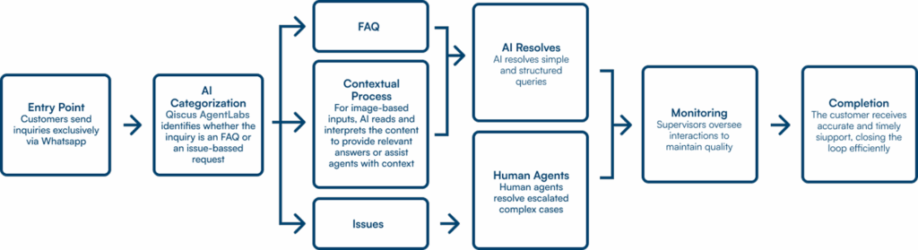 To address this, PCS implemented Qiscus AgentLabs as the first layer of customer engagement, integrated with the WhatsApp Business API as the primary communication channel. The solution was designed not just to automate responses but to enable AI reasoning, allowing the system to decide whether to resolve a question itself, retrieve contextual data, or escalate the issue to a human agent.